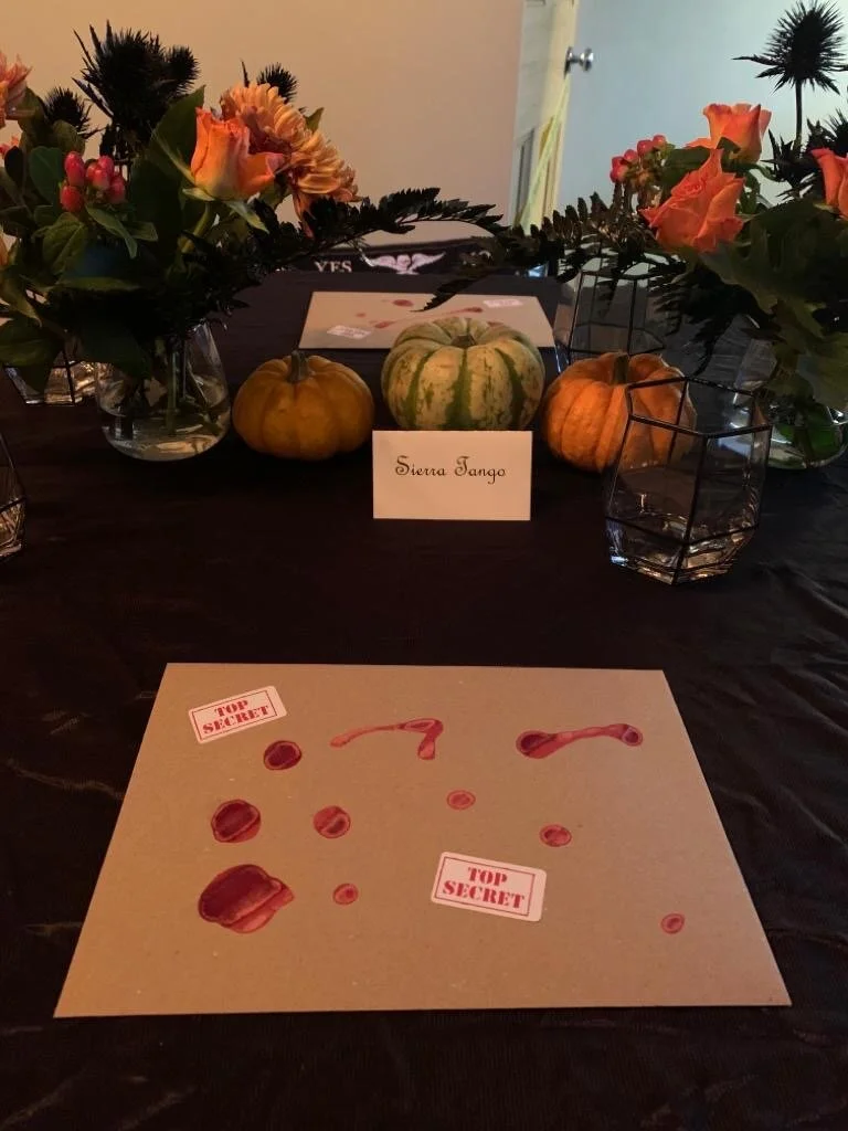 The table was set for eight people. It was a tight squeeze and we didn’t have enough chairs, but we made it work. I made place names and envelopes with ‘blood’ spatter and ‘top secret’ labels on them. I placed each person’s character sheet inside the envelope. I threw black rags over everything and decorated with some flowers and mini pumpkins that I picked up from Lidl.